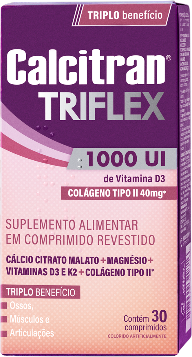 Calcitran Triflex é um suplemento alimentar que combina Cálcio citrato malato, Colágeno Tipo 2, Vitaminas D3 e K2 e Magnésio para auxiliar no fortalecimento e manutenção da saúde óssea, além de melhorar o funcionamento muscular, a função articular e a flexibilidade corporal.